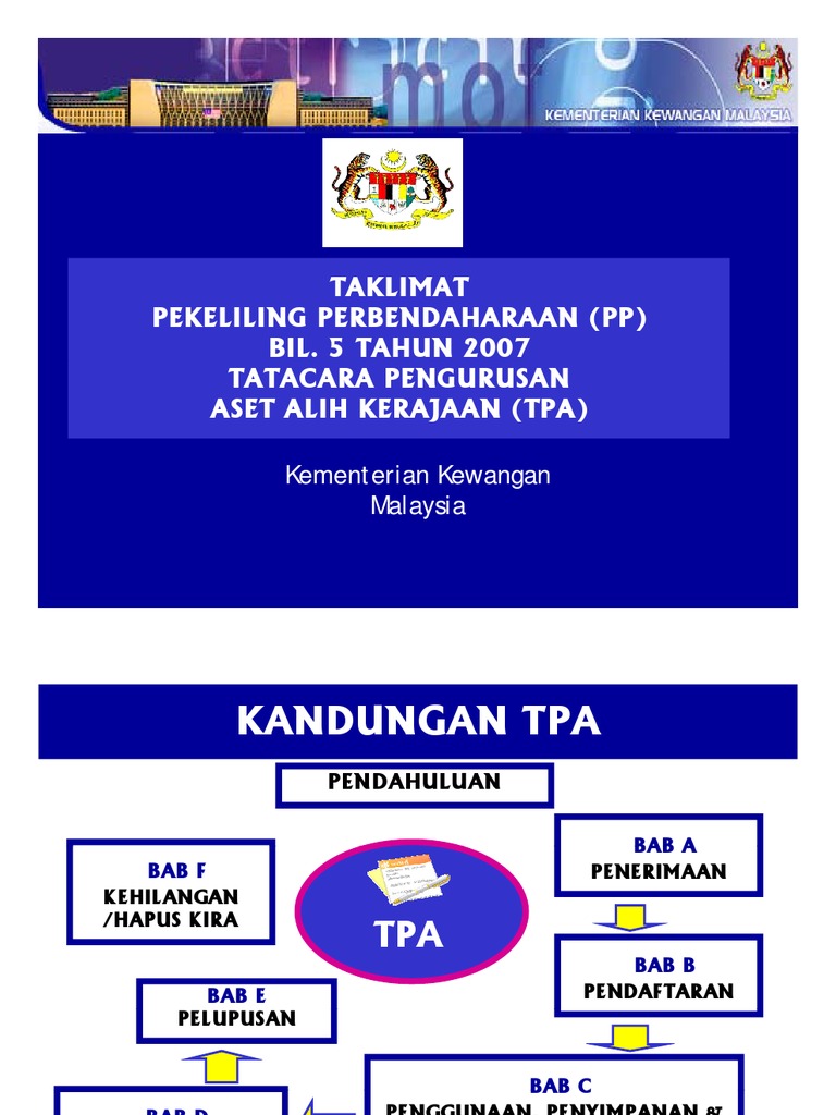 Bahagian perolehan dan penswastaan kementerian kesihatan malaysia. Memberi penjelasan mengenai pekeliling perbendaharaan bil.5 tahun 2007 tatacara pengurusan aset alih kerajaan (tpa). Nota kursus pengurusan aset siri 1 pada 13 hingga 15 ogos 2018full description. Memperkemas dan memantapkan peraturan pengurusan aset alih kerajaan. Tatacara pengurusan aset alih kerajaan (tpa) ini adalah tatacara bagi menguruskan harta modal dan inventori meliputi.
